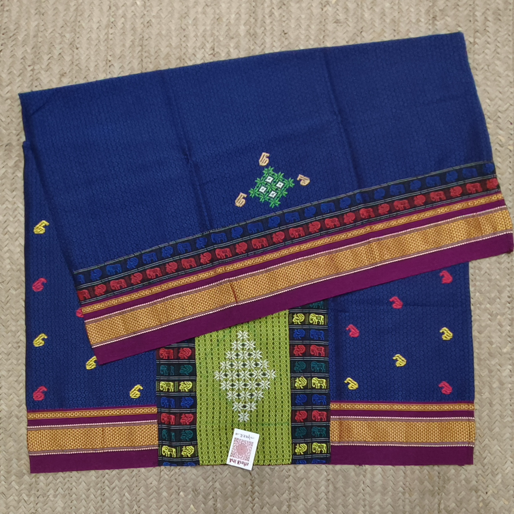 Royal Blue With Neon Green Patch Khunn Blouse Piece With Handmade Negi Kasuti.