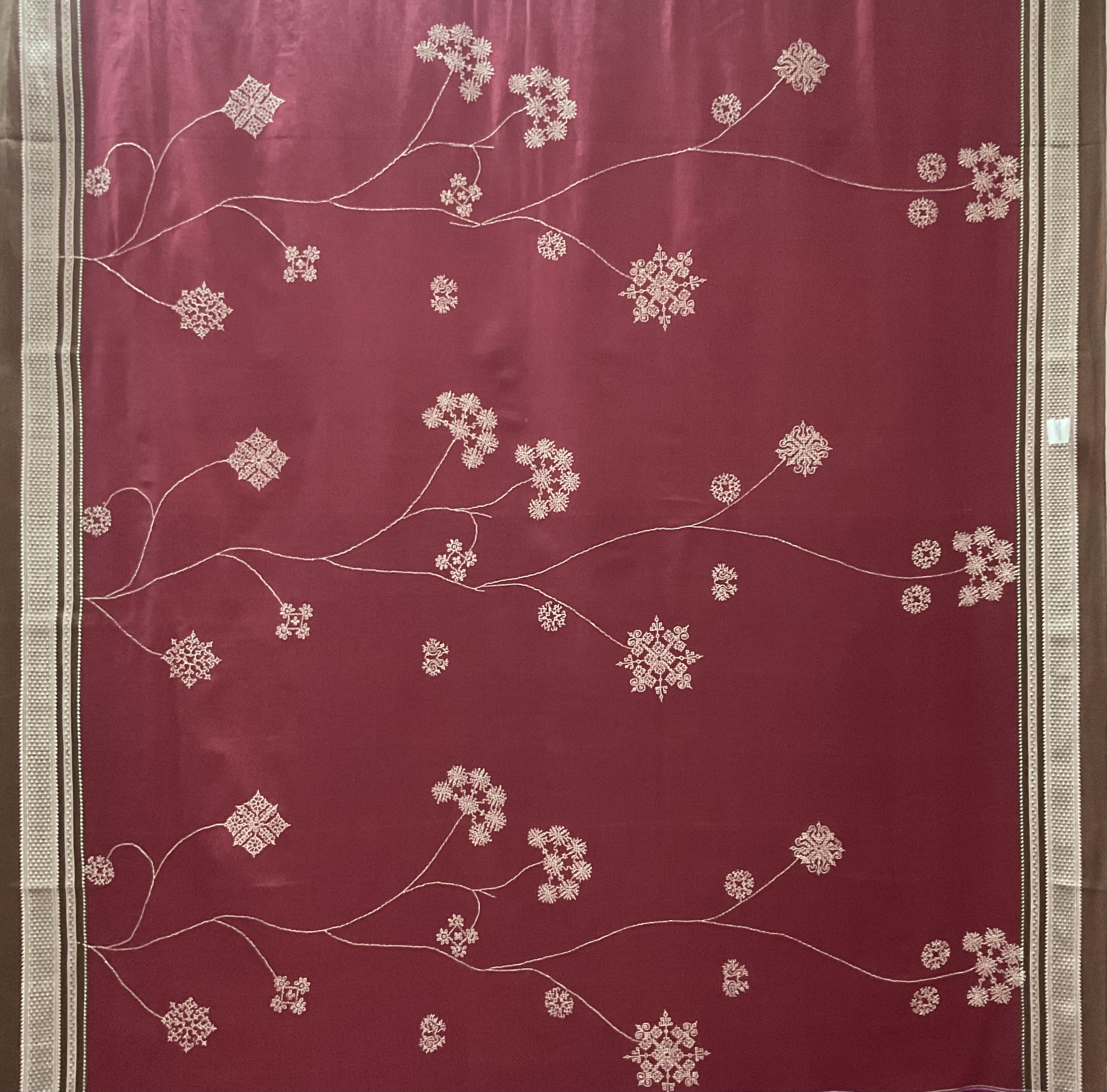 A maroon Ilkal handloom saree with our signature balli (creeper) design is an unique piece of tradition and the modern.