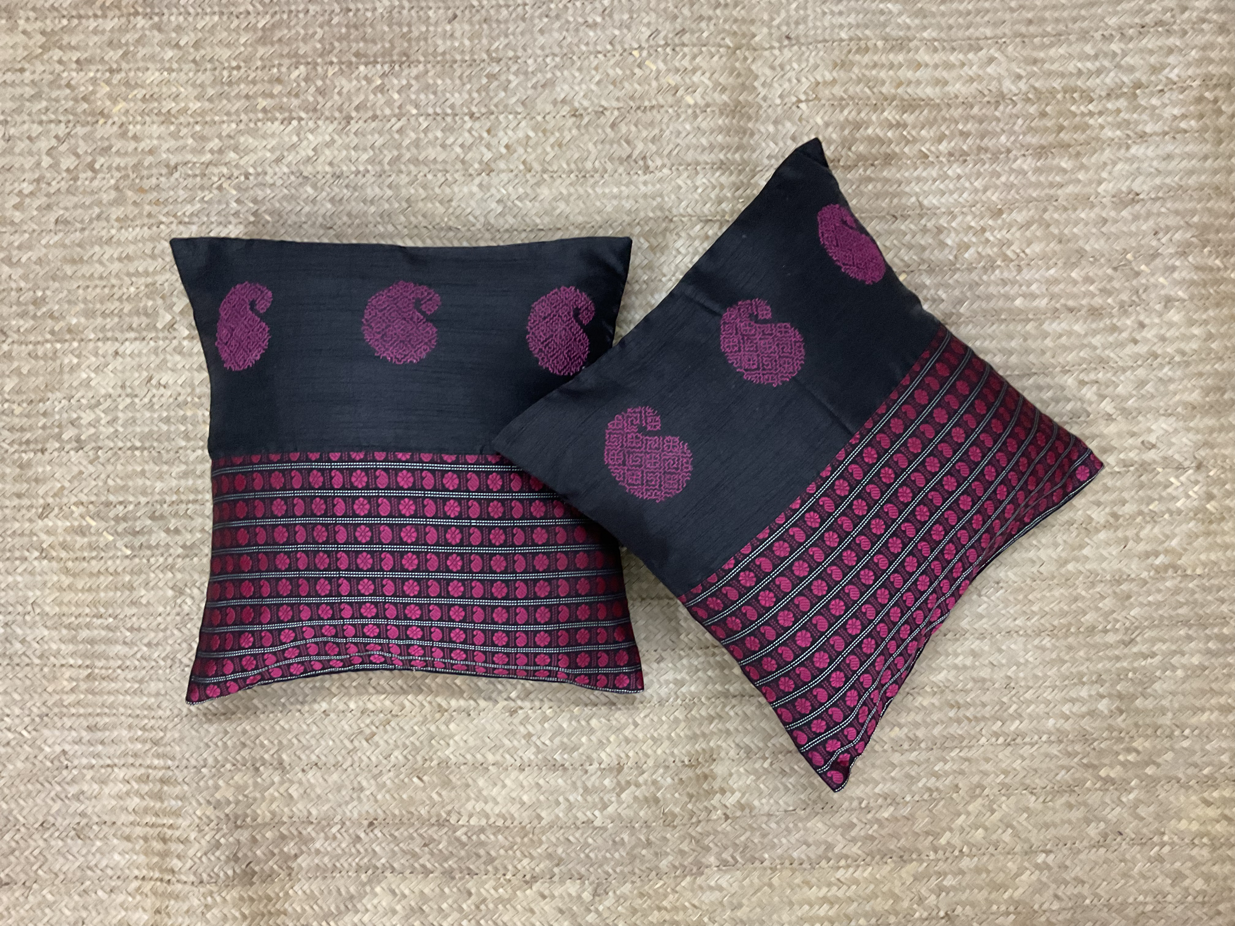 KhunnWith Dupion cushion cover with intricate hand made kasuti . It's a beautiful balance