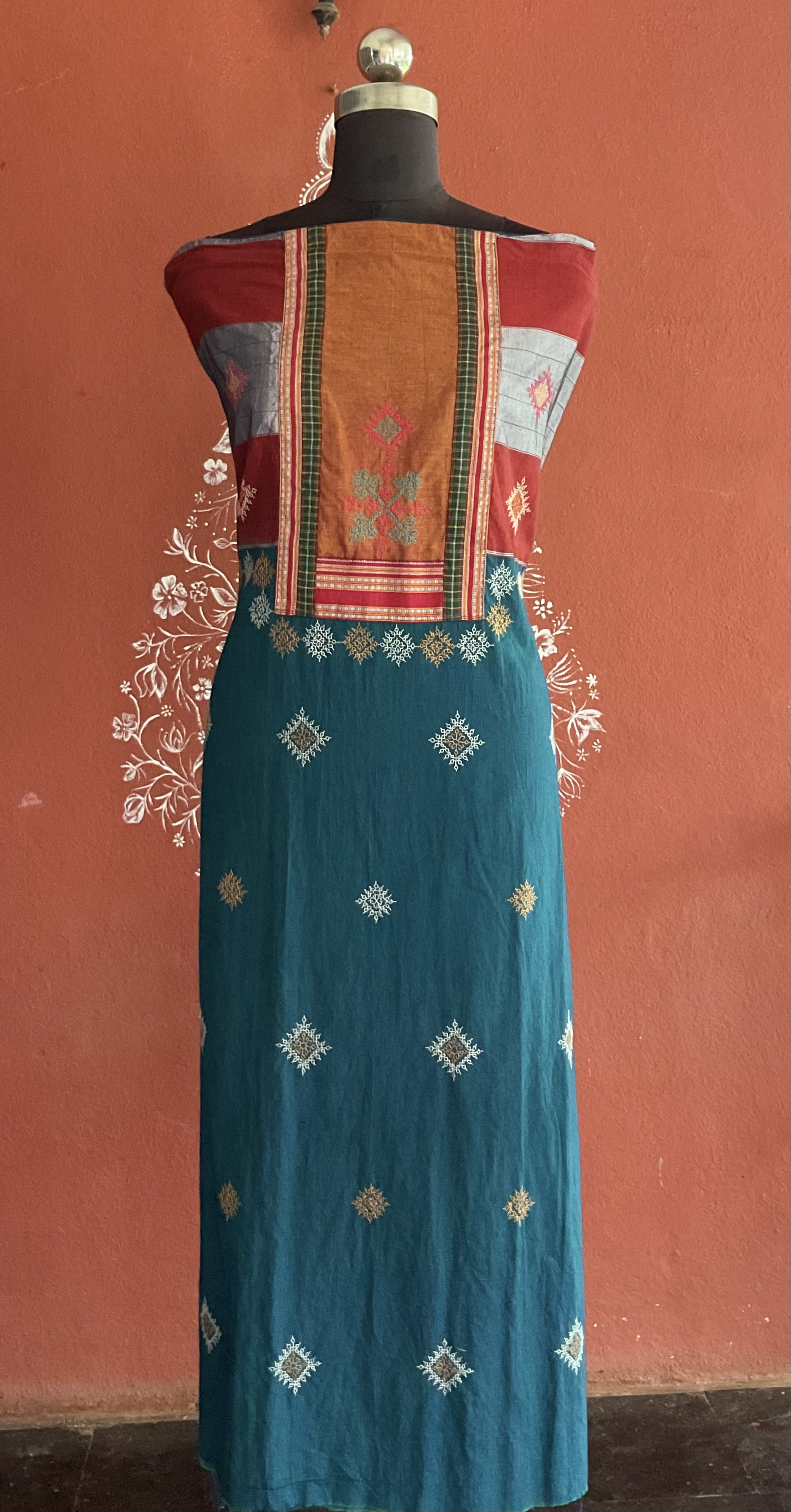 A beautiful Betgeri cotton kurta piece with an unique patch work yoke and intricate Handmade Kasuti.