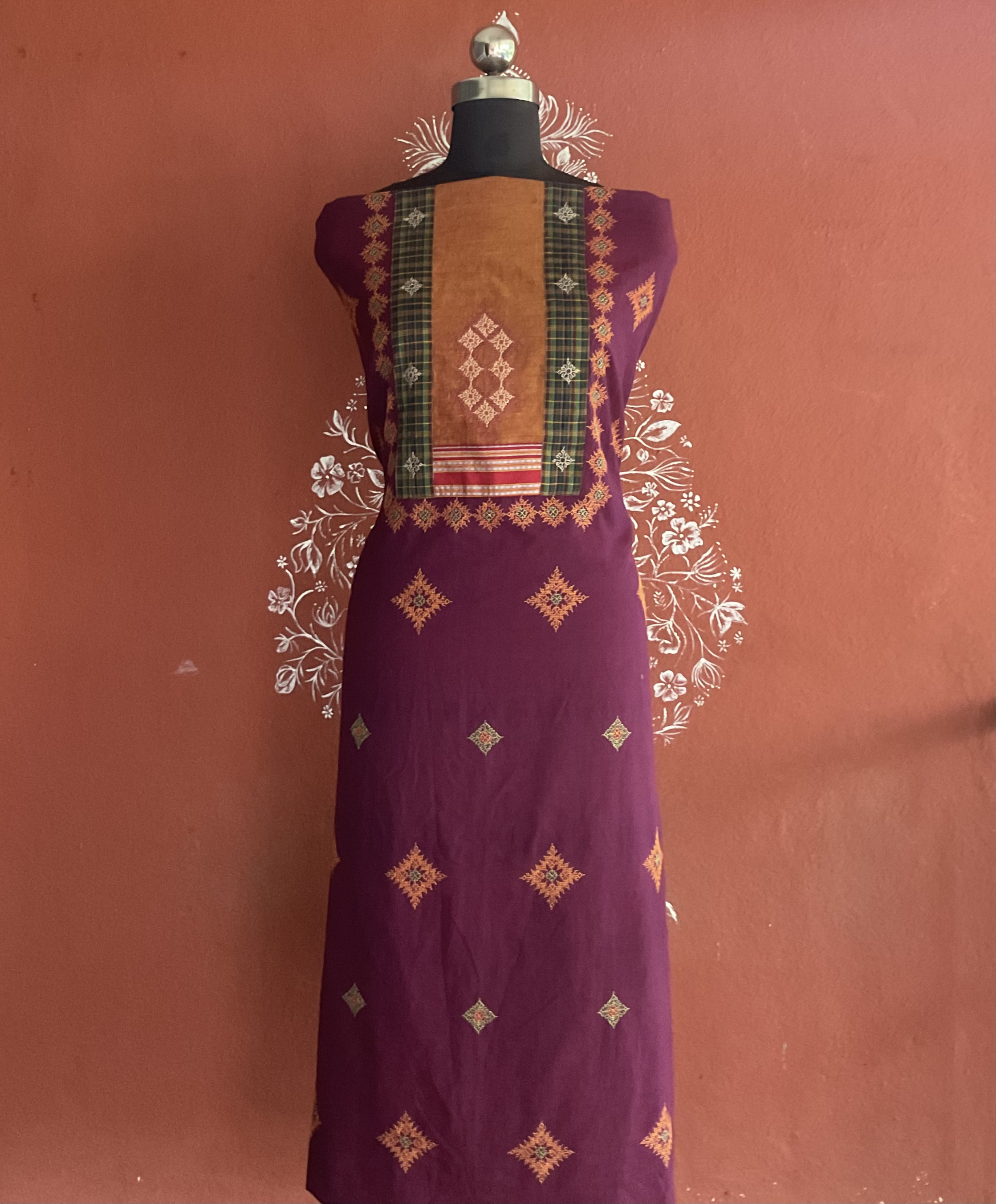 A beautiful cotton kurta piece with an unique patch work yoke and intricate Handmade Kasuti.