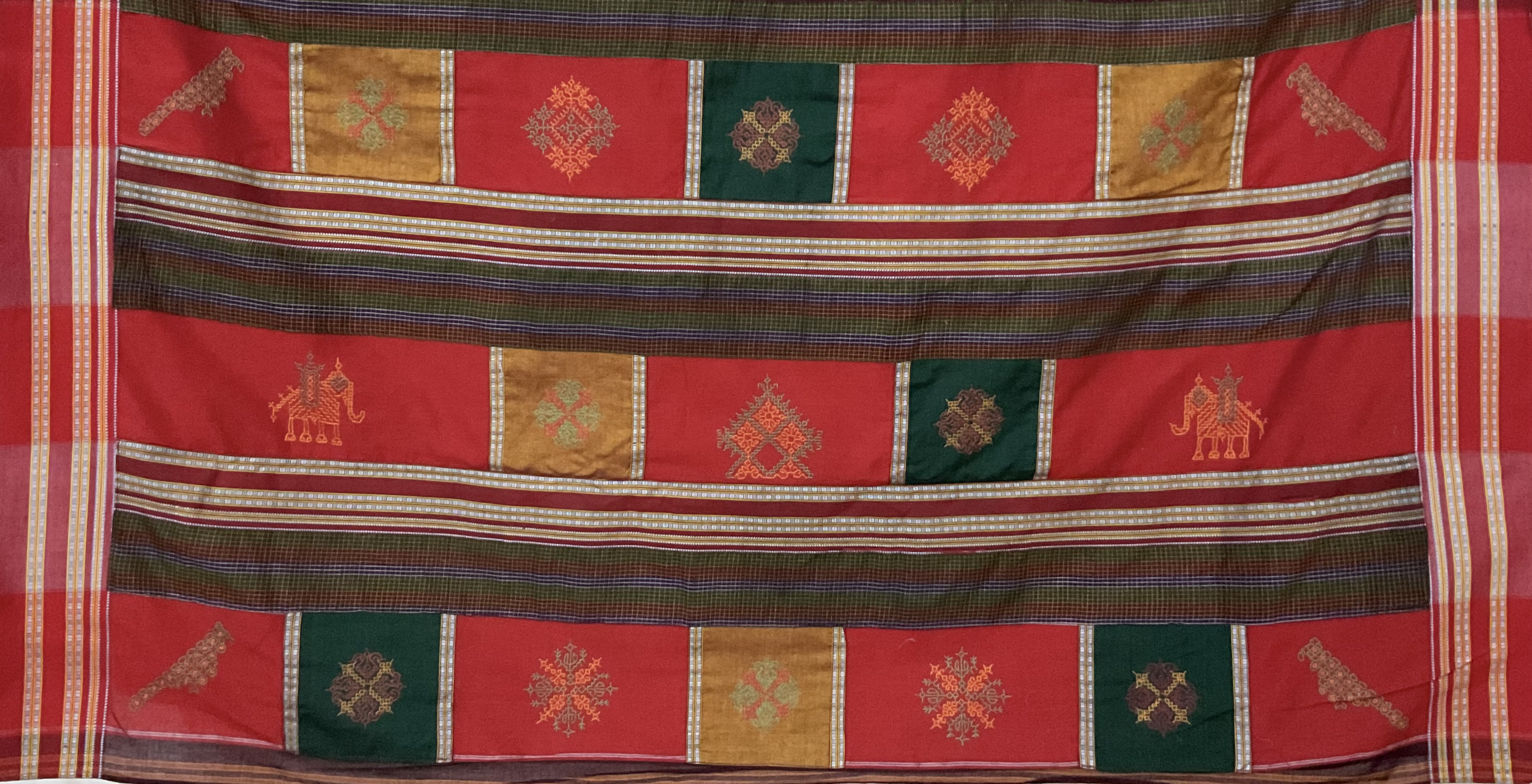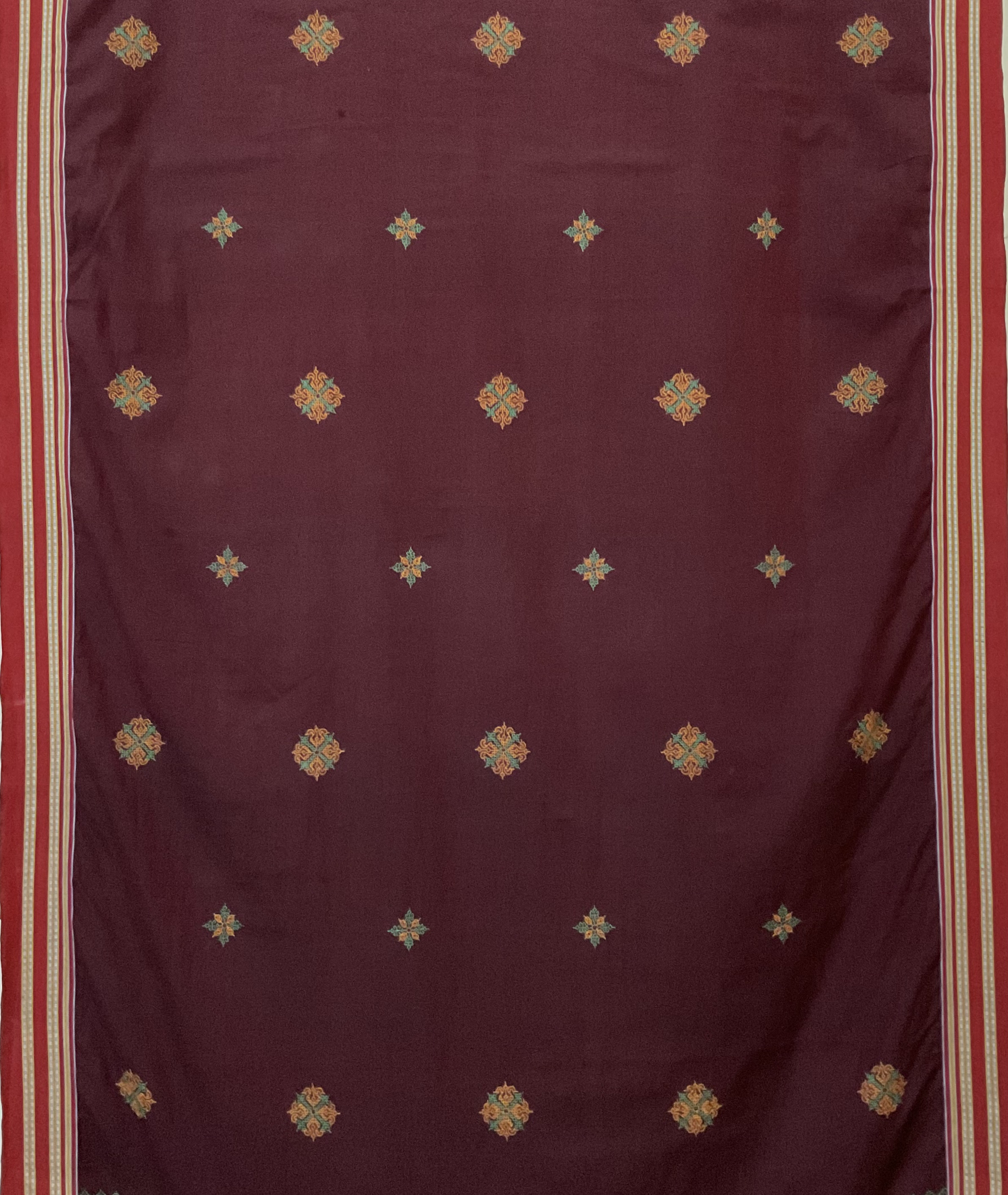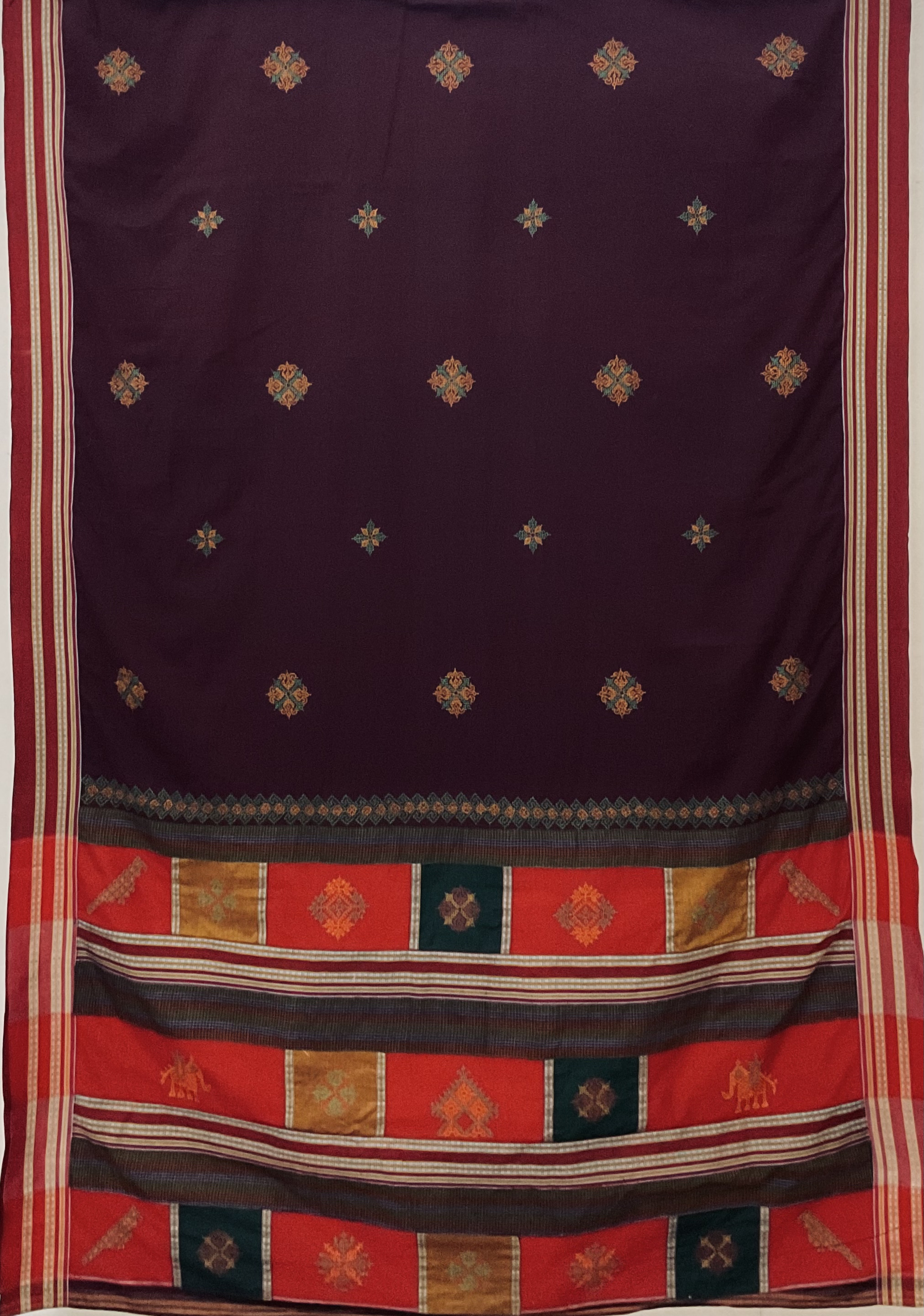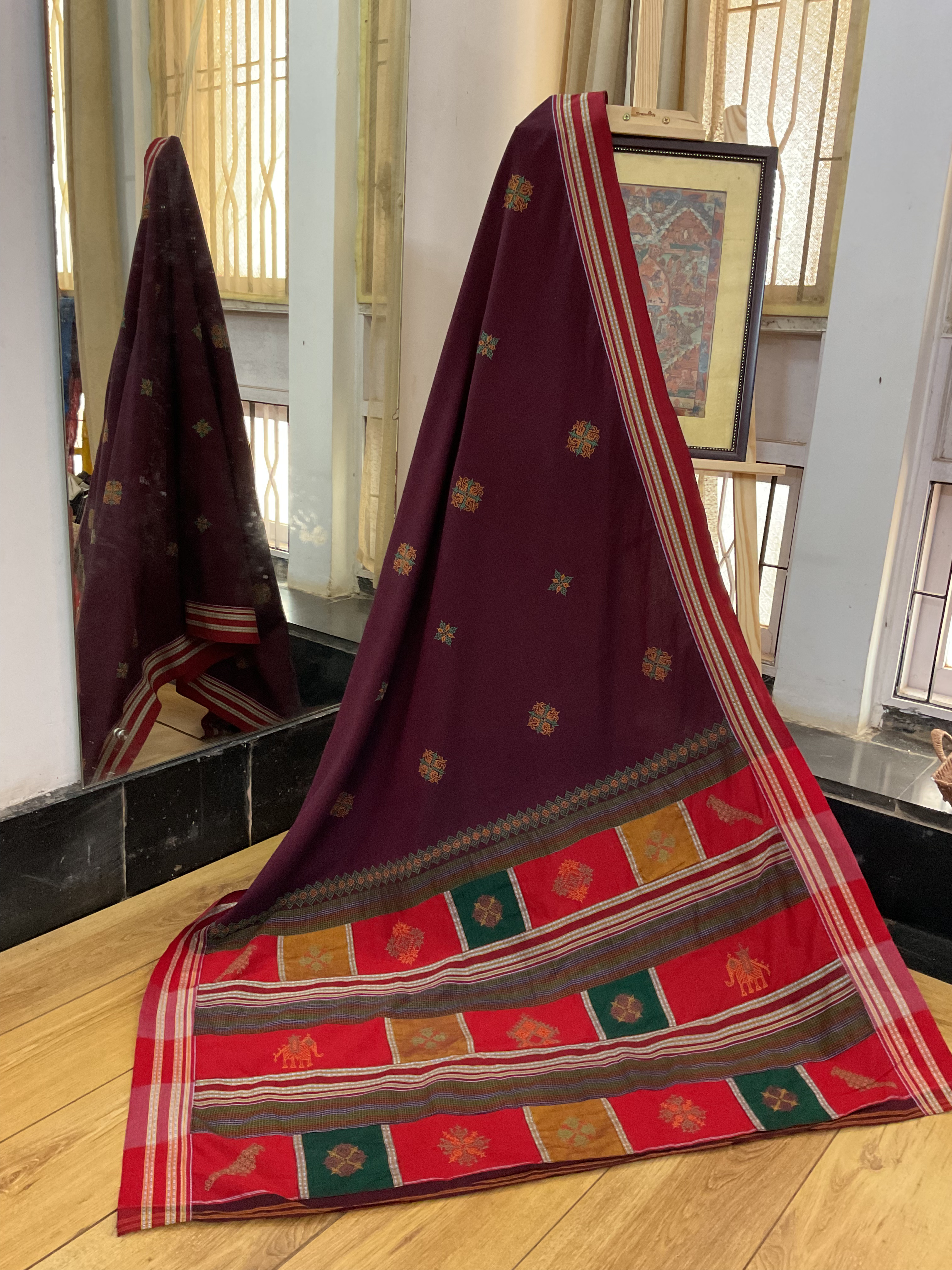 Dark Maroon Betgeri Cotton With Handmade Kasuti An unique cotton saree with patch work pallu and handmade kasuti!!