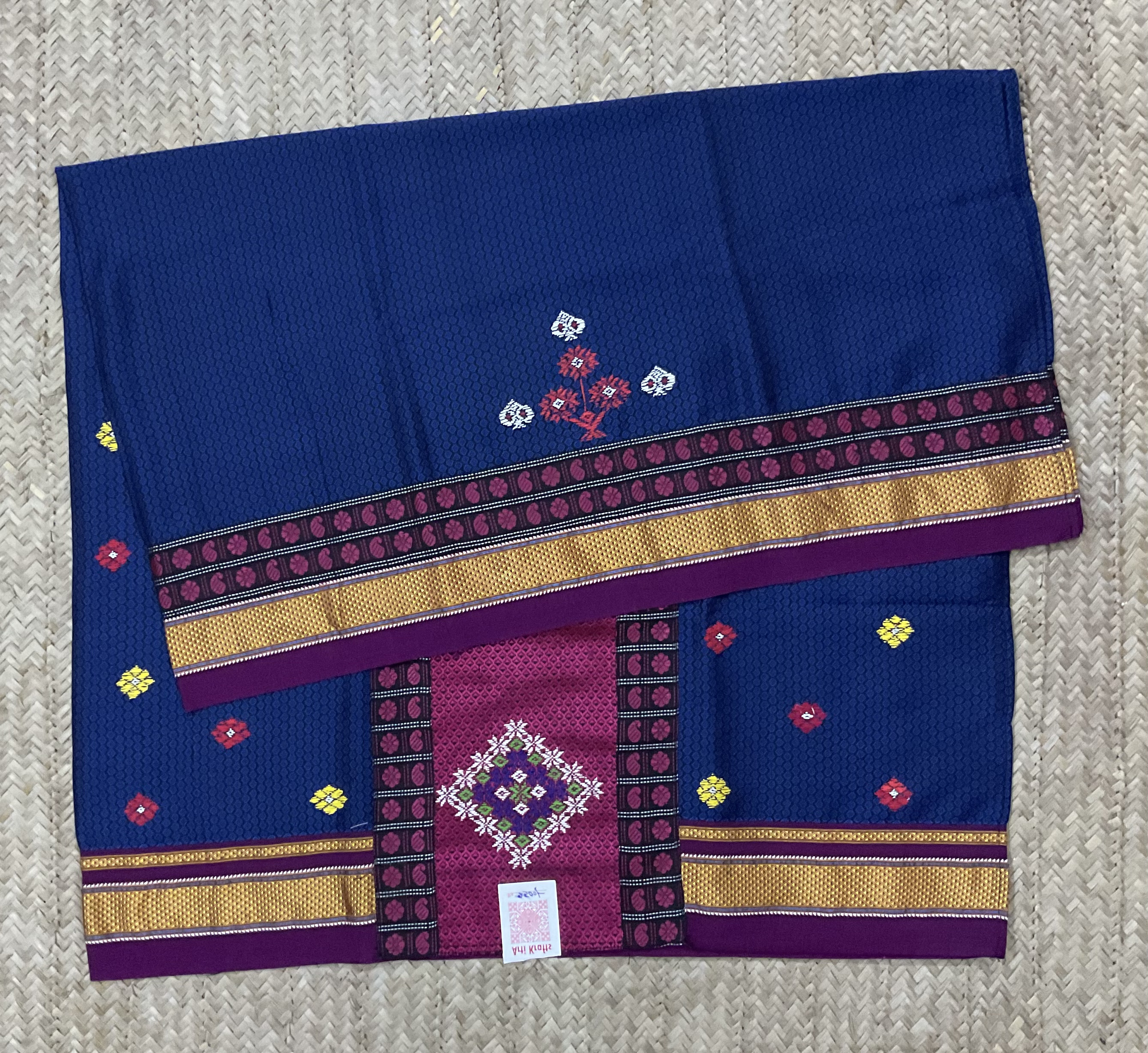 The beauty of khunn blouse piece is further enhanced by vibrant contrast patch work On the back and sleeves, And intricately embroidered with handmade negi kasuti.