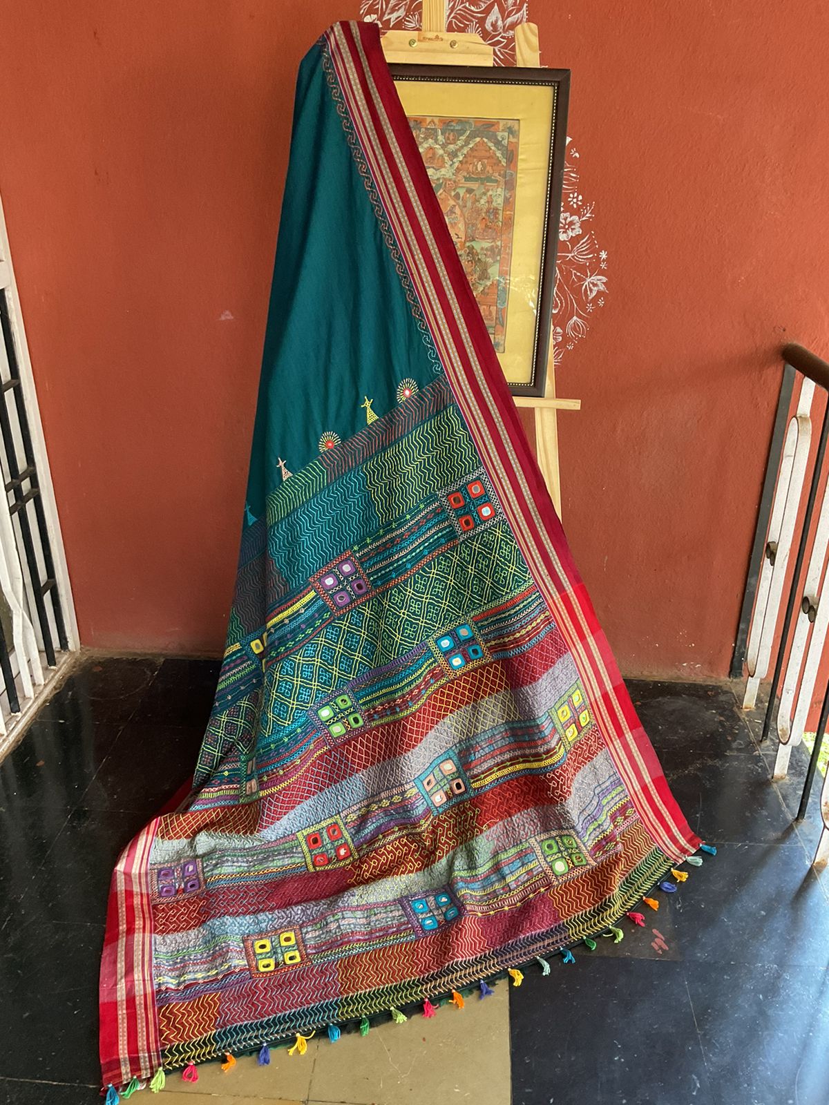 A pleasant Rama colour Betgeri cotton saree with lovely Lambani embroidery is droolworthy. Grab this now and make your festival colourful!!
